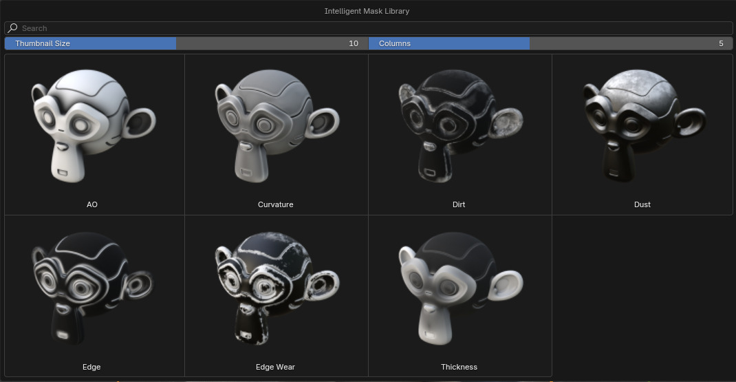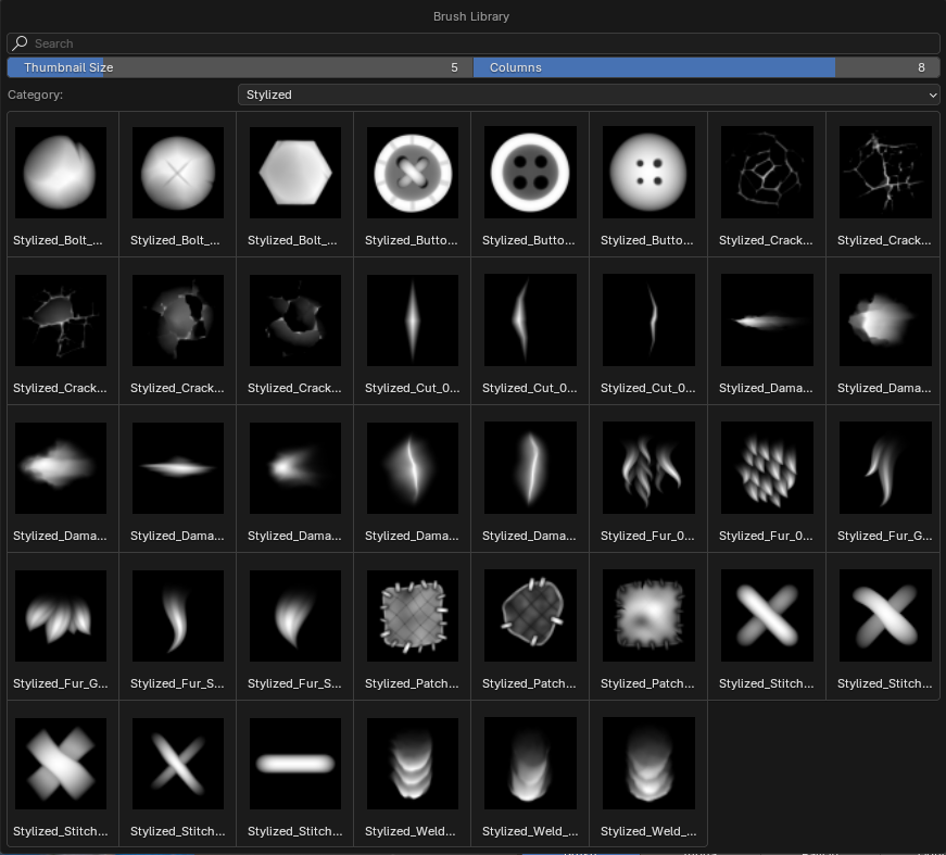 Nearly 1000 grayscale textures for use as masks, including a variety of custom brushes for flexible painting and a library of high-quality Hard Surface textures (ZenShaders).